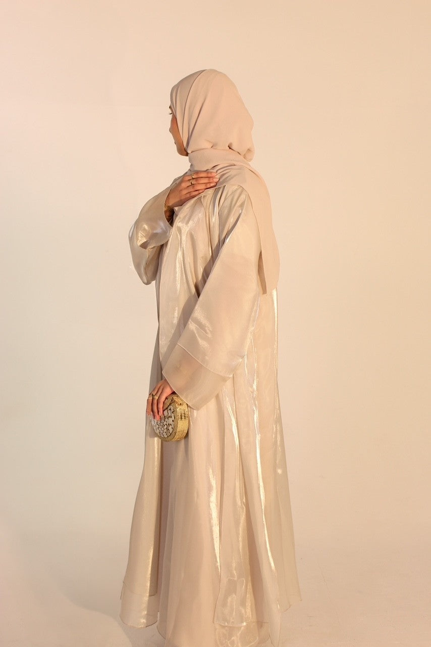 An abaya that represents sophistication. The light airy fabric of organza gives the abaya a delicate feel, providing both comfort and elegance. The flowy silhouette drapes create a flattering yet modest shape. The double layered organza enhances its modesty. Perfect for special occasions or formal gatherings, this abaya combines timeless style with a modern, refined look, making it a versatile addition to any wardrobe.