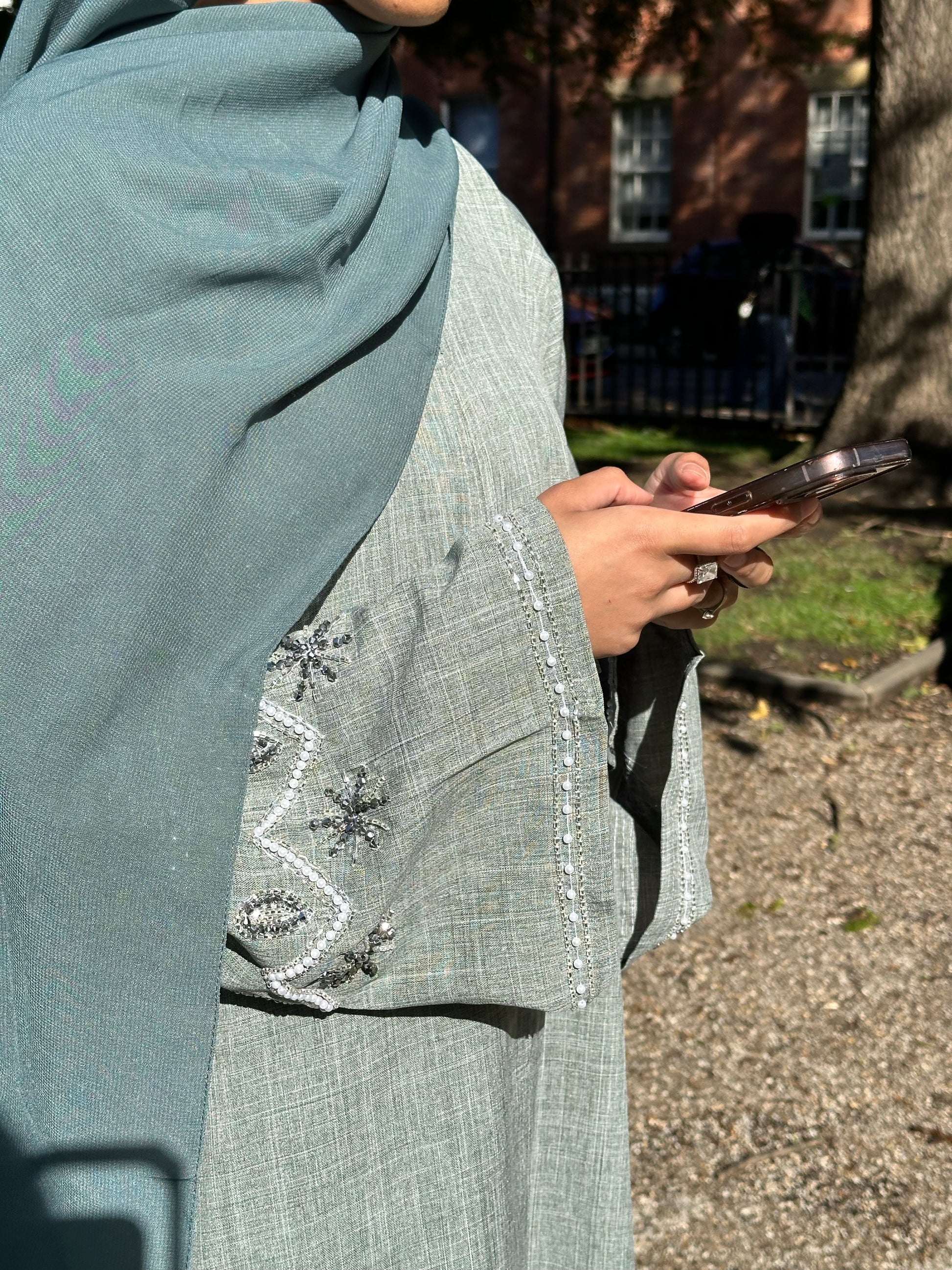 Our sage green abaya from our linen collection is a striking blend of modesty and elegance. Made from breathable linen fabric , perfect for casual and semi formal occasions - comes with a matching hijab