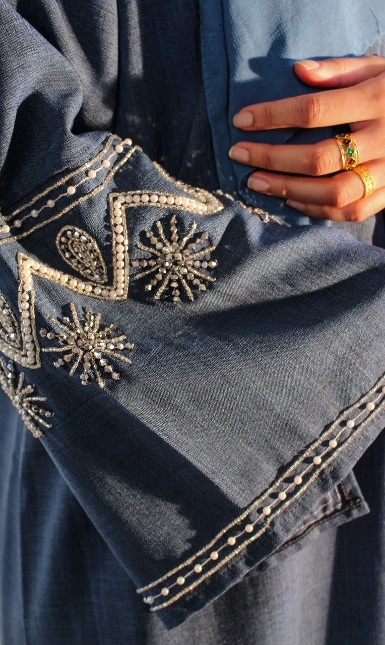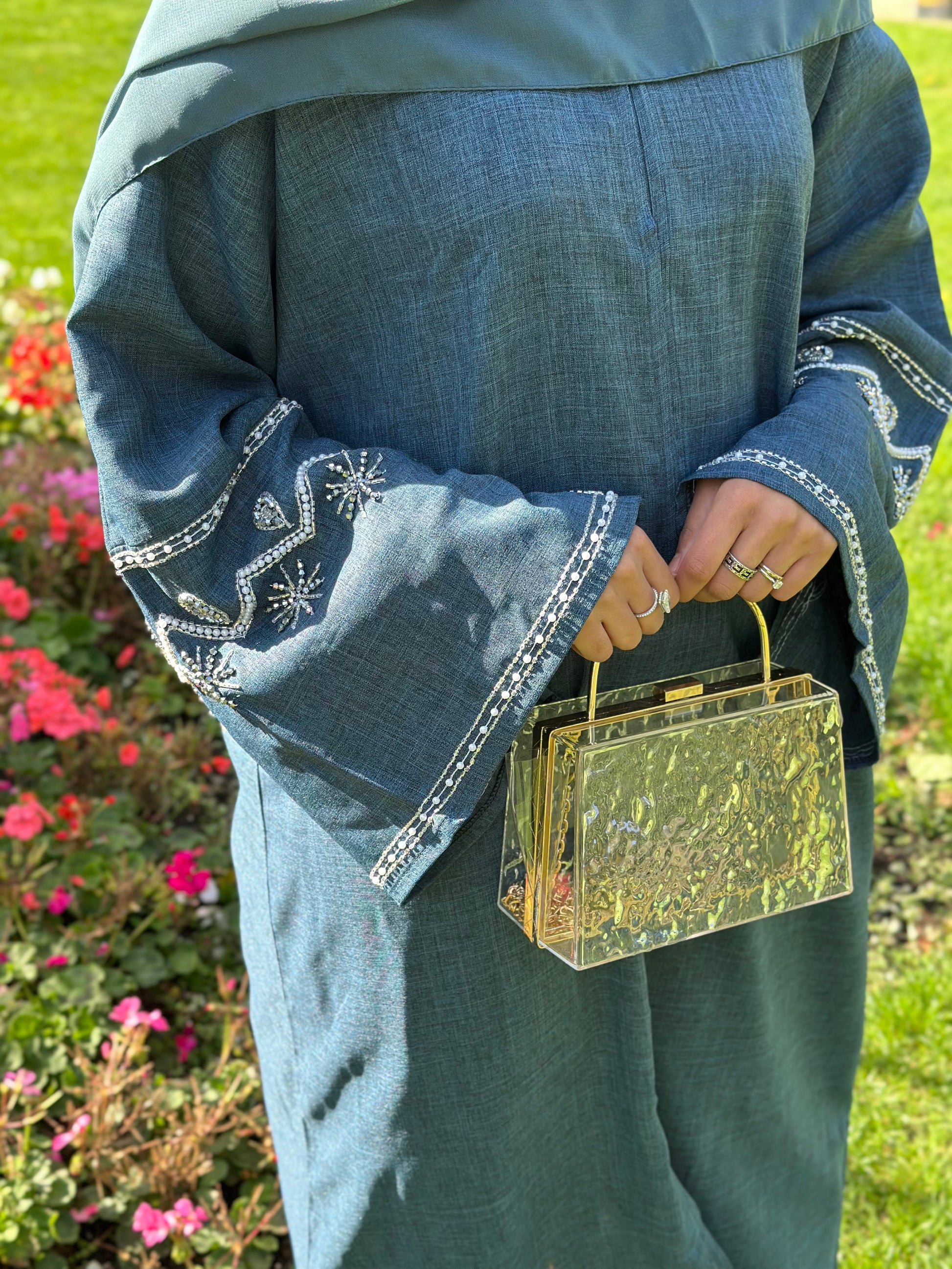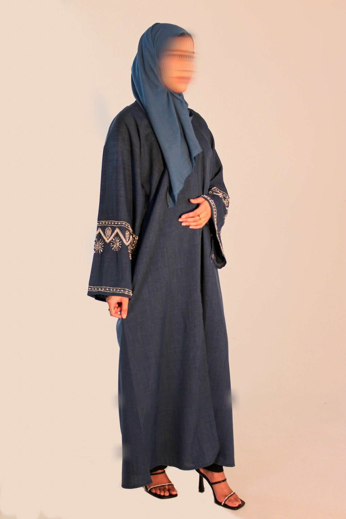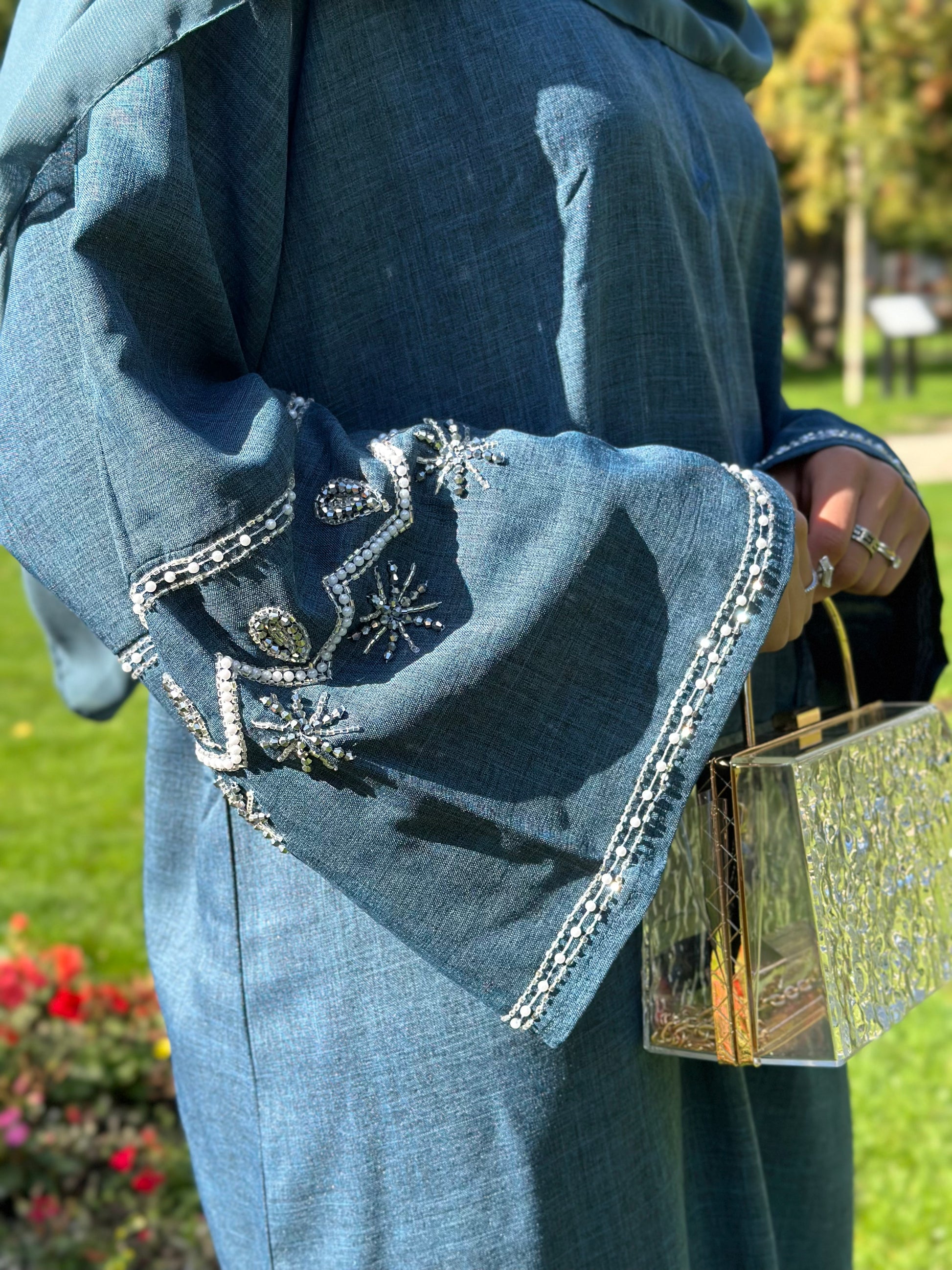 This elegant turquoise linen abaya offers a perfect blend of simplicity and sophistication. Crafted from high quality, breathable linen. It is ideal for casual and formal occasions. The lightweight fabric ensures comfort and style. The embellished pearl sleeves are a highlight of the abaya, making it a versatile wardrobe staple.